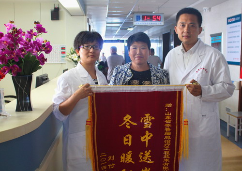 2014年8月14日上午,在醫(yī)院腫瘤科完成自體血液采集工作后,患者劉某家屬解女士激動地向山東省齊魯細胞治療工程技術(shù)有限公司相關(guān)人員及醫(yī)院腫瘤科全體醫(yī)護人員敬獻了旌旗,表達謝意。
