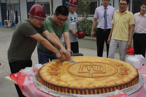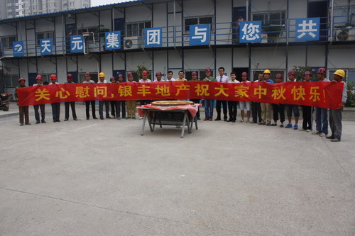 中秋節當天,超級月餅出現在項目建設工地現場。工友們見到唐冶公司營銷部來送如此巨型的月餅既感到新奇同時又十分歡喜。項目工地負責人代表全體工友對銀豐集團的這一溫暖舉動表示感謝,并承諾一定不辜負銀豐集團的信任和厚愛,保質保量的迅速推進工程進展,爭取早日讓銀豐·唐郡項目的業主住進自己的新房子。