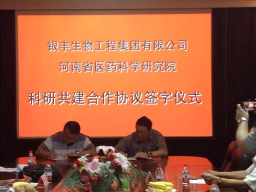 2014年7月8日,銀豐生物集團與河南省醫藥科學研究院合作協議簽約儀式在鄭州市隆重舉行,生物集團總裁生德偉與河南省醫藥科學研究院院長楊波共同簽署了共建協議。河南省科技廳社發處處長楊光、鄭州大學副校長常俊標、別榮海、科技處處長趙明皞受邀參加簽約儀式。楊光處長在儀式上發表重要講話,介紹了目前科技部在各省設立人類遺傳資源庫的政策,表示銀豐生物集團與河南省醫藥科學研究院強強聯手共建河南省人類遺傳資源庫是利國利民的好事,科技廳將給予大力支持。