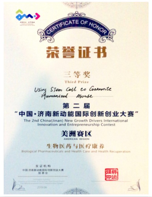 銀豐生物美國公司報名的2個項(xiàng)目成功突圍參加到?jīng)Q賽。其中“利用臍血干細(xì)胞生產(chǎn)人源化免疫系統(tǒng)小鼠”項(xiàng)目經(jīng)過激烈角逐榮獲三等獎,并將回國參加在濟(jì)南舉辦的高層次人才創(chuàng)新創(chuàng)業(yè)大賽的決賽。